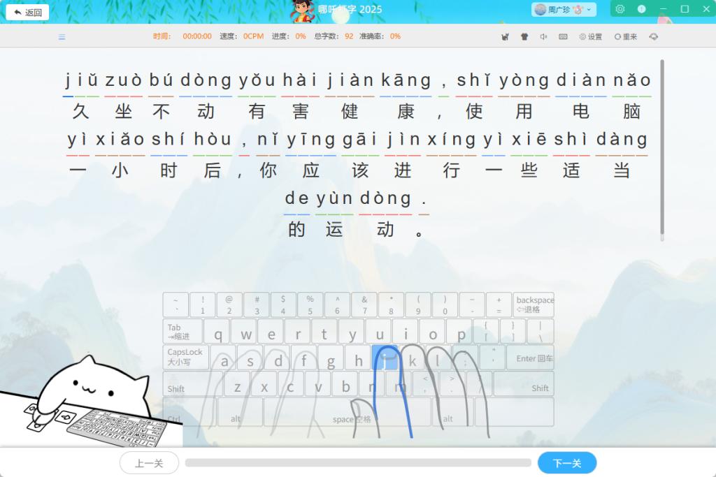 它最让我佩服的是 “抓重点”,直接跳过那些没用的花哨功能,上来就练真本事。有个 “高频词库” 特别实用,我翻了翻,全是孩子平时写作业、发消息常用的,比如 “所以”“但是”“现在”,这些词看着简单,可孩子总爱打错,要么少个字母,要么声调不对。 打字猫 会把这些词挑出来,反复让孩子练,比如 “因为” 这个词,有的孩子总打成 “yinwei”(少了 g),软件就会标出来,还提示 “前鼻音‘in’,后鼻音‘g’别忘啦”。