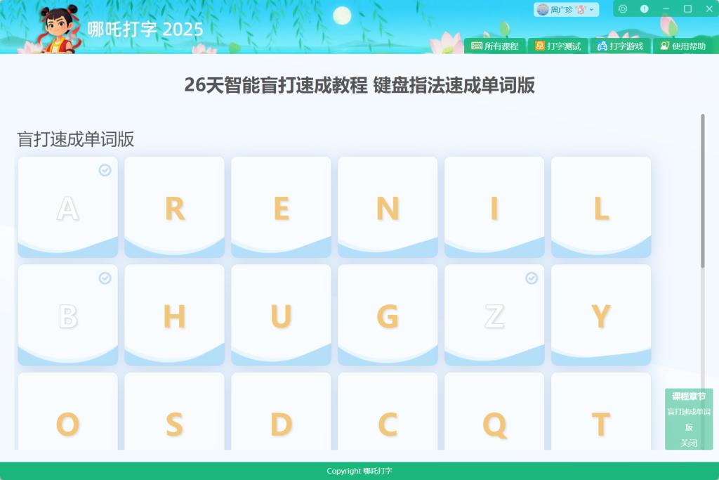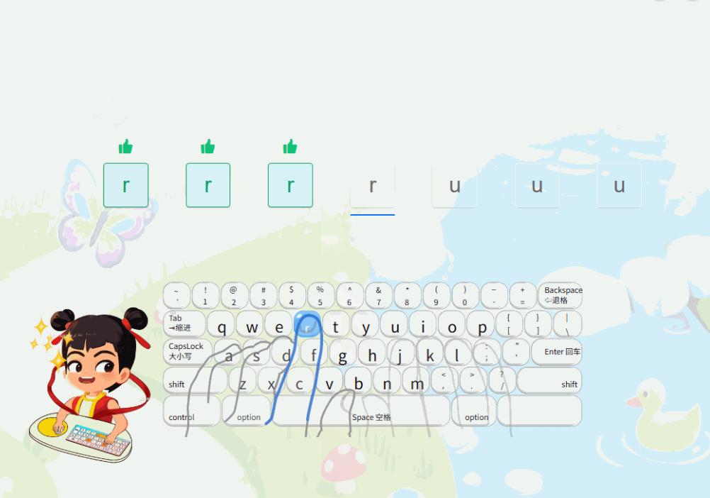 哪吒打字的课程体系特别科学。首先是键盘指法分层训练,把键盘上的键位科学划分成上排、中排、下排,26 个字母和常用标点符号都是渐进式练习。这比传统的 F/J 键重复训练强多了,更符合中文输入场景。每次练习只增加一个字母,节奏特别合理,不会让你一下子记一大堆还没熟悉过的键位。而且,新字母会出现在每一个单词里,这种密集的重复练习能快速帮你建立肌肉记忆,学习效果特别好。
