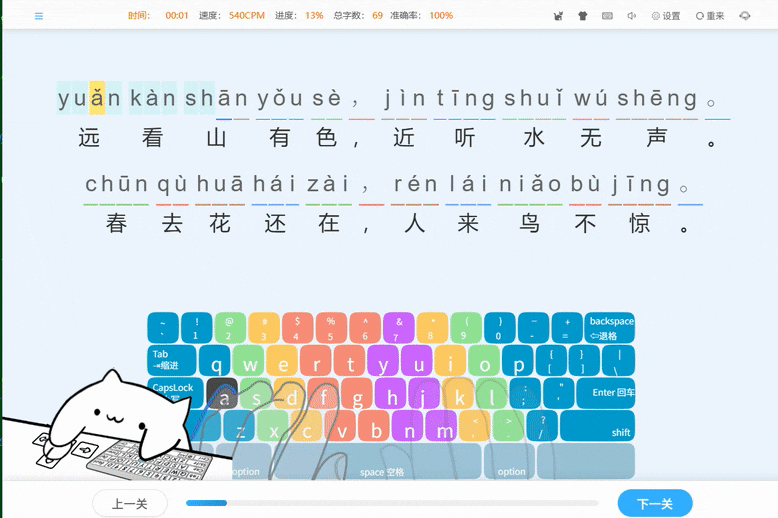 在中文打字训练方面,哪吒打字尤为注重。第 8-9 周的拼音基础和组合练习,34 个关卡帮助用户回顾声母韵母,培养拼音感;第 10 周的拼音输入练习,28 个关卡让用户用拼音学习打字知识;第 11 周通过 31 个关卡,让用户用拼音拼写唐诗宋词,提升输入连贯性和准确性;第 12-14 周分别针对二字词、三字词、多字词及流行语进行练习,共 17+15+17 个关卡,培养输入时的停顿感,让打字更流畅。