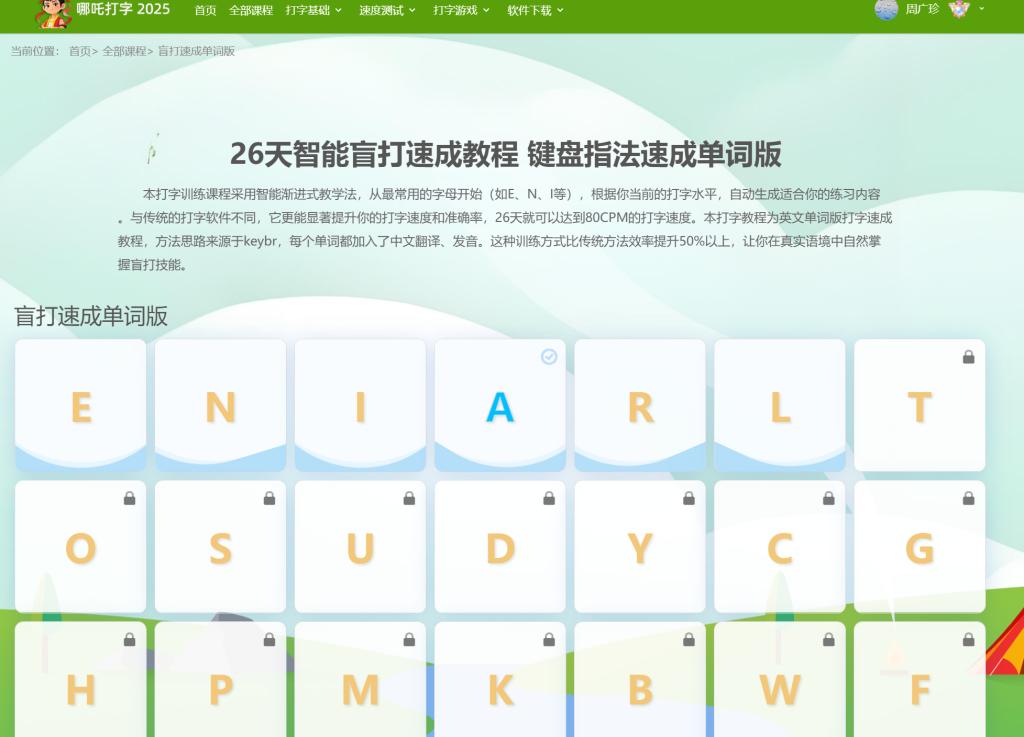 想提速度的话,先别太较真——50 WPM以上足够高效编程了。但要是低于40 WPM,真可以针对性练练,比如哪吒打字的《26天盲打速成教程》,这教程思路来自keybr,每个单词都加了中文翻译和发音,用智能渐进式教学。