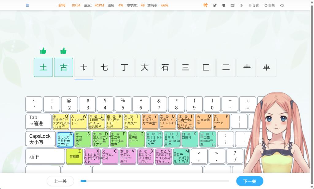 说五笔练习绕不开金山打字通,就像说输入法绕不开五笔一样。它的在线版保留了桌面端的扎实功底,字根表做得清清楚楚,每个键位的字根都标着不同颜色,横区红色竖区绿色,一目了然。我刚开始学五笔时就靠这个分清了竖钩归竖区提归横区,这个细节对新手来说太重要了。