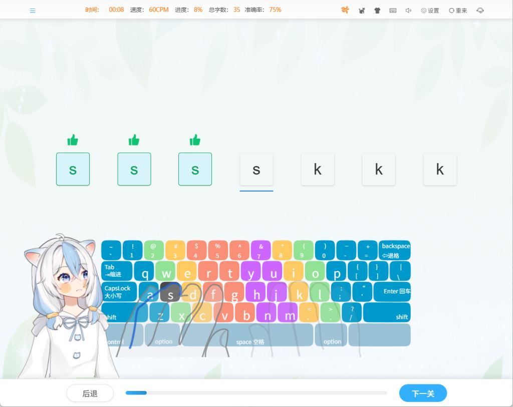 这软件在国外火了好些年,没想到中文版居然挺接地气。六百多节课,一节就练两三个字母,比如专攻“asdfjkl;”这八个基准键,动画还会标清楚:左手食指管“F”,右手食指管“J”,讲得明明白白。