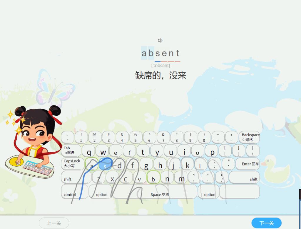每天我大概花1小时闯3个关卡,每个关卡100个单词。前10天基本都在跟这几个字母较劲,系统会统计每个字母的练习次数——E、N、I这些高频的,我练了不下1000次,手都形成条件反射了。练完系统还会给分析,比如发现我打“L”总慢半拍,就自动多安排含“L”的单词,直到我跟上节奏。