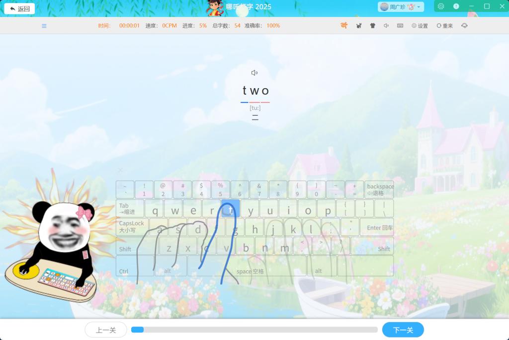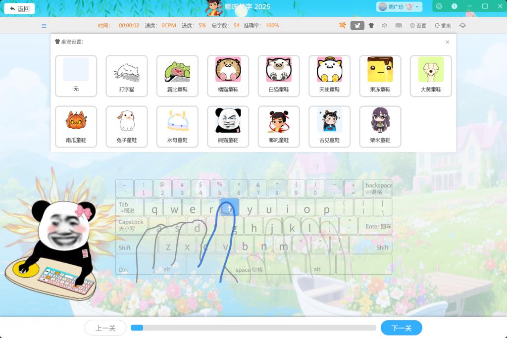 用趣味吊着孩子练,根本不用催:把练习做成闯关升级,从 “塑料小白” 到 “星河宗师”,10 个段位,闯 3 关攒够星星就能升段。关卡里的小哪吒、熊猫头这些卡通宠物,打对了就举牌子 “你真棒”,错了就耷拉耳朵,孩子为了让宠物 “高兴”,每天主动要练。键盘皮肤能换成彩虹的、卡通贴纸的,音效还有 “鸡你太美”“小狗叫”,我班上男生爱用恐龙音效,女生喜欢樱花键盘,练半小时都不挪窝。