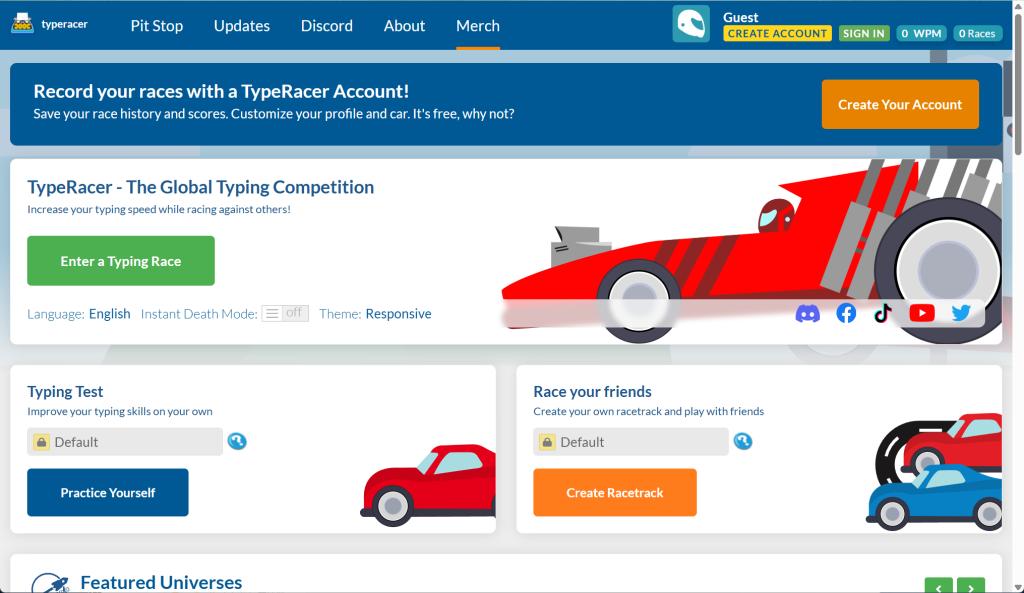 第四个TypeRacer,这可是 “竞技型” 测速!跟全球网友比谁打得快,文章都是名著片段或新闻,打着打着还能学知识。它的好处是逼你 “又快又准”,毕竟错一个字就得回头改,特能锻炼专注力。