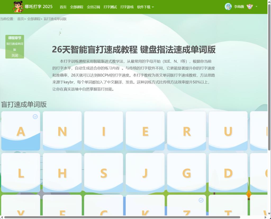 别的软件一上来就让你打英文句子,咱们孩子哪看得懂?哪吒打字不一样,它知道咱们是从拼音开始学打字的。所以它的课程,是从最基础的a、o、e、i这些单韵母开始的,然后慢慢加上声母,拼成音节,一步一步来,就跟语文课学拼音一个样,特别自然。
