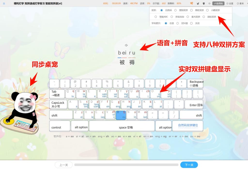 功能上也特贴心,照顾到了不同输入法的学习者。拼音入门的朋友,文章里会带全拼音提示,“澎湃(péng pài)”“憧憬(chōng jǐng)” 这些容易读错的词,拼音标得清清楚楚,不怕拼错;用双拼的更方便,8 种双拼方案都有对应提示,比如小鹤双拼里 “张(zh+ang)” 该怎么拆,软件会标出来,帮你记准键位;五笔用户也别担心,86 版、98 版、06 新世纪版的拆字练习提示都有,打 “想” 字时,会提示 “木 + 目 + 心(shn)”,帮你巩固字根,练得更扎实。